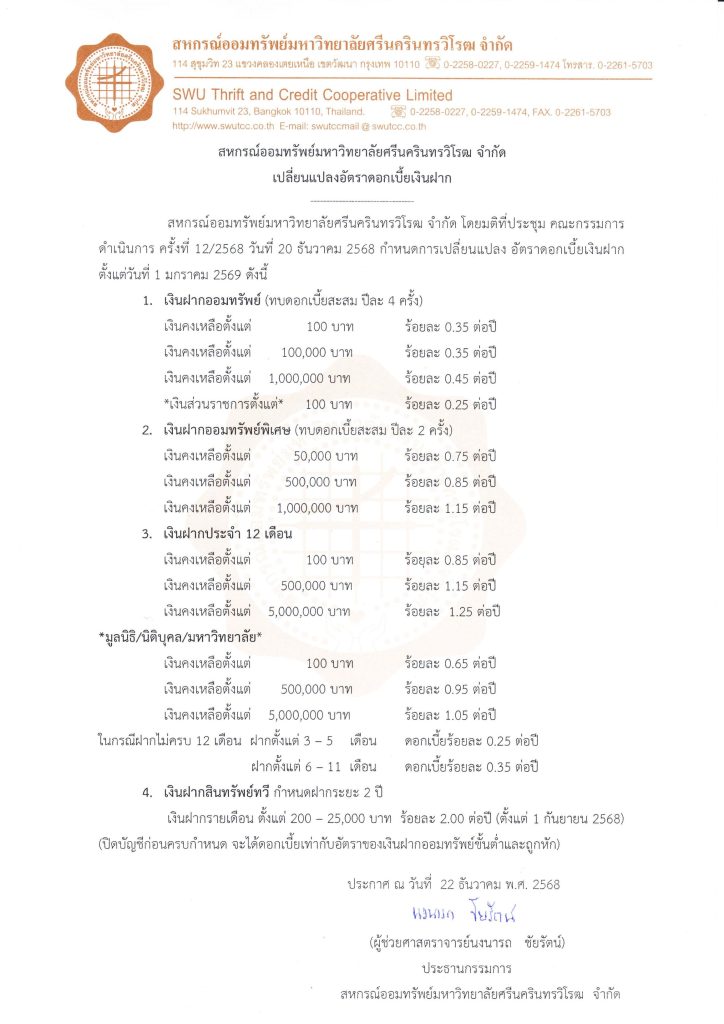สหกรณ์ออมทรัพย์มหาวิทยาลัยศรีนครินทรวิโรฒ จำกัด ได้รับ ผลการจัดระดับชั้นความเข้มแข็งของสหกรณ์และกลุ่มเกษตรกร ประจำปี 2568 ในระดับ “ชั้น 1”