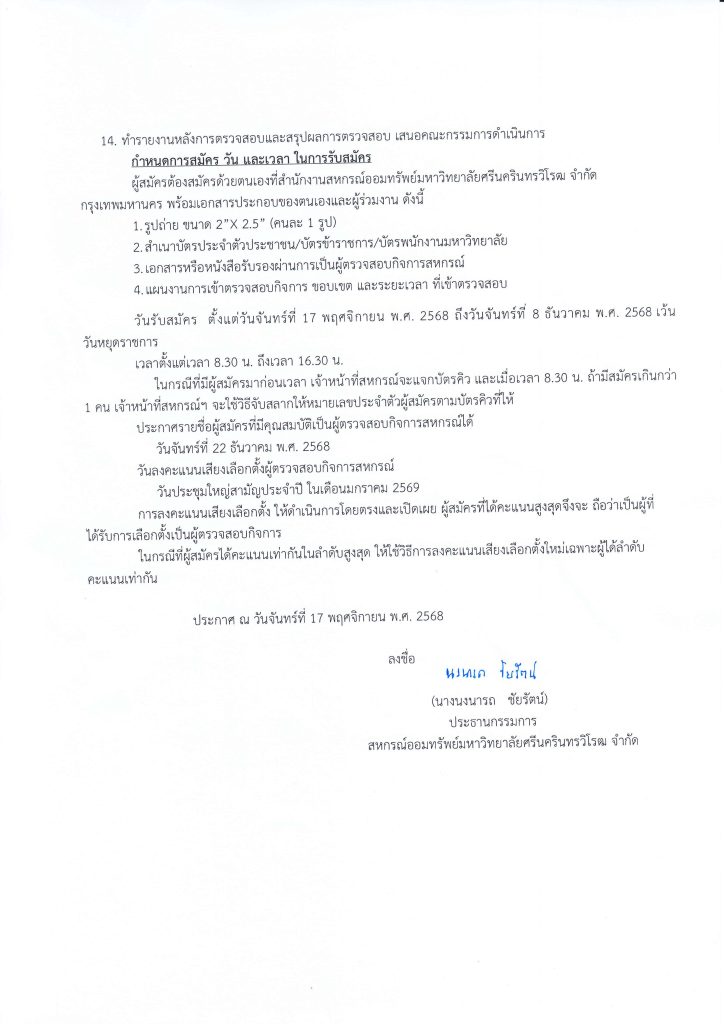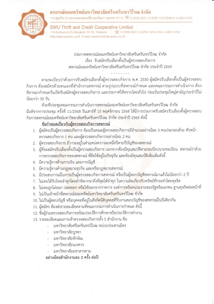 17/11/2025 By Poonmee Jitjaithiang ประกาศ รับสมัครรับเลือกตั้งเป็นผู้ตรวจสอบกิจการสหกรณ์ออมทรัพย์มหาวิทยาลัยศรีนครินทรวิโรฒ จำกัด ประจำปี 2569 Share: Share List