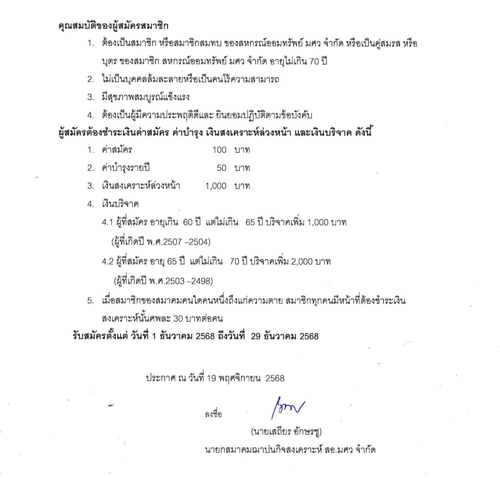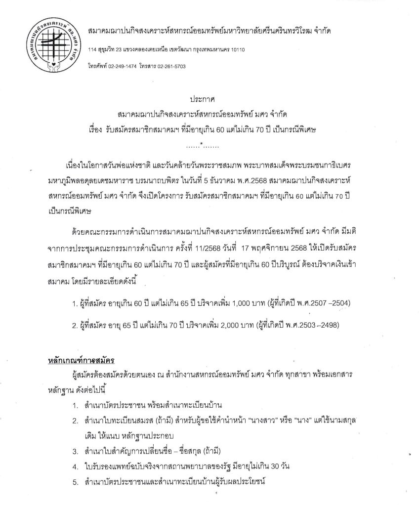 19/11/2025 By Poonmee Jitjaithiang ประกาศ สมาคมฌาปนกิจสงเคราหะ์สหกรณ์ออมทรัพย์มหาวิทยาลัยศรีนครินทรวิโรฒ จำกัด รับสมัครสมาชิกสมาคมฯ ที่มีอายุเกิน 60 แต่ไม่เกิน 70 ปี เป็นกรณีพิเศษ Share: Share List