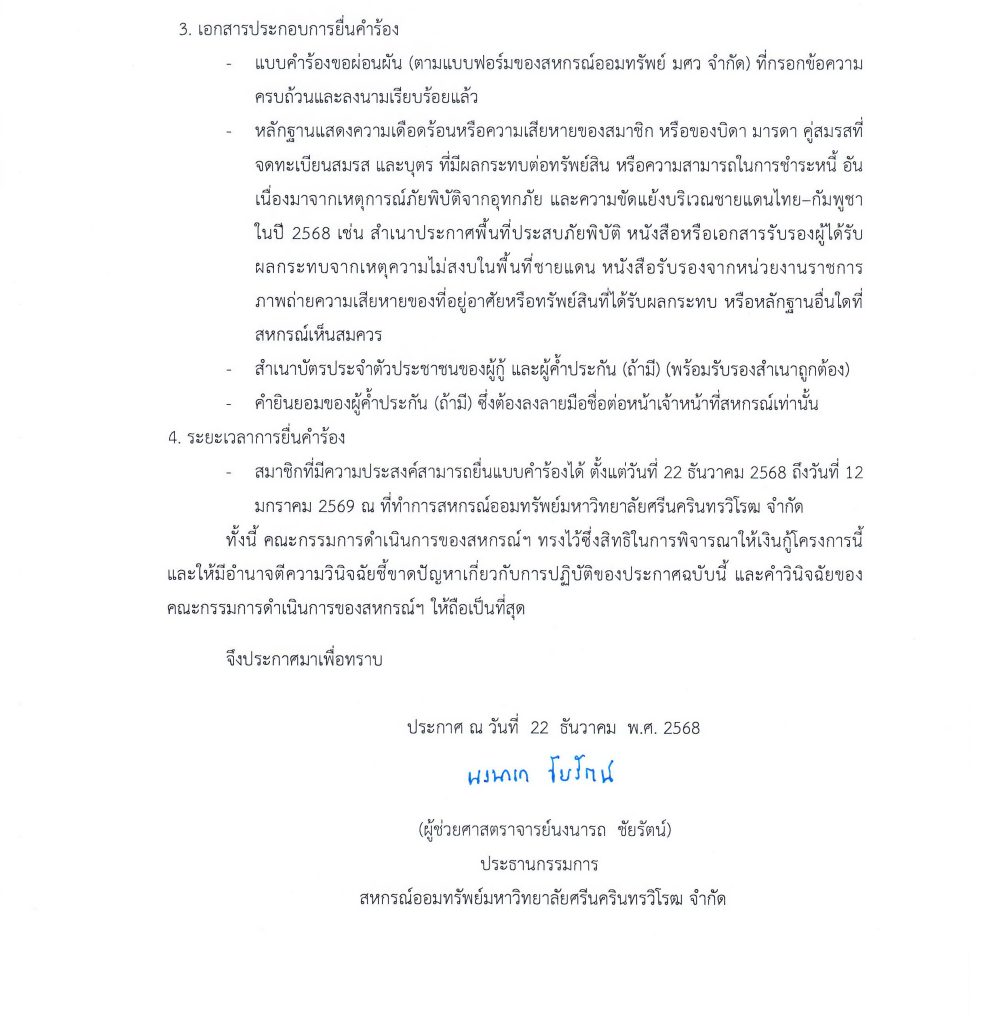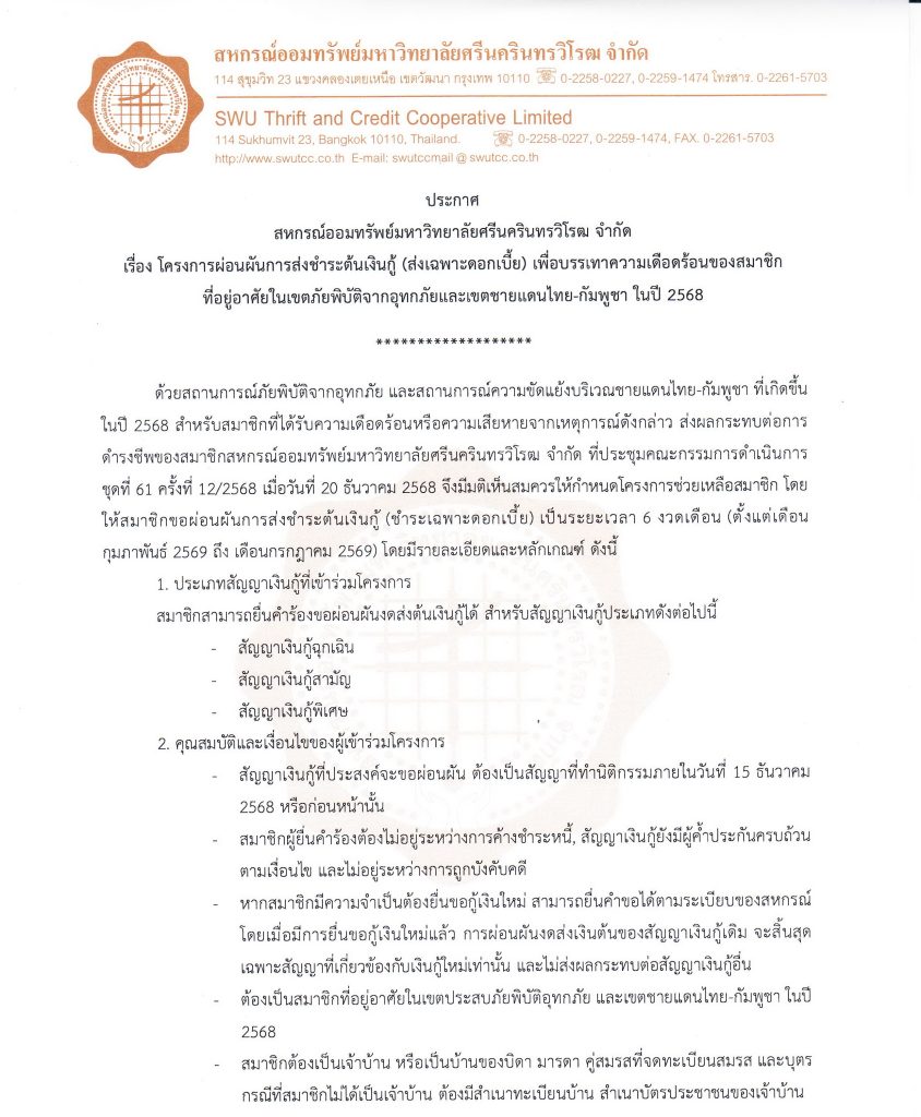 22/12/2025 By Poonmee Jitjaithiang ประกาศ โครงการผ่อนผันการส่งชำระต้นเงินกู้ (ส่งเฉพาะดอกเบี้ย) เพื่อบรรเทาความเดือดร้อนของสมาชิก ที่อยู่อาศัยในเขตภัยพิบัติจากอุทกภัยและเขตชายแดนไทย-กัมพูชา ในปี 2568 Share: Share List