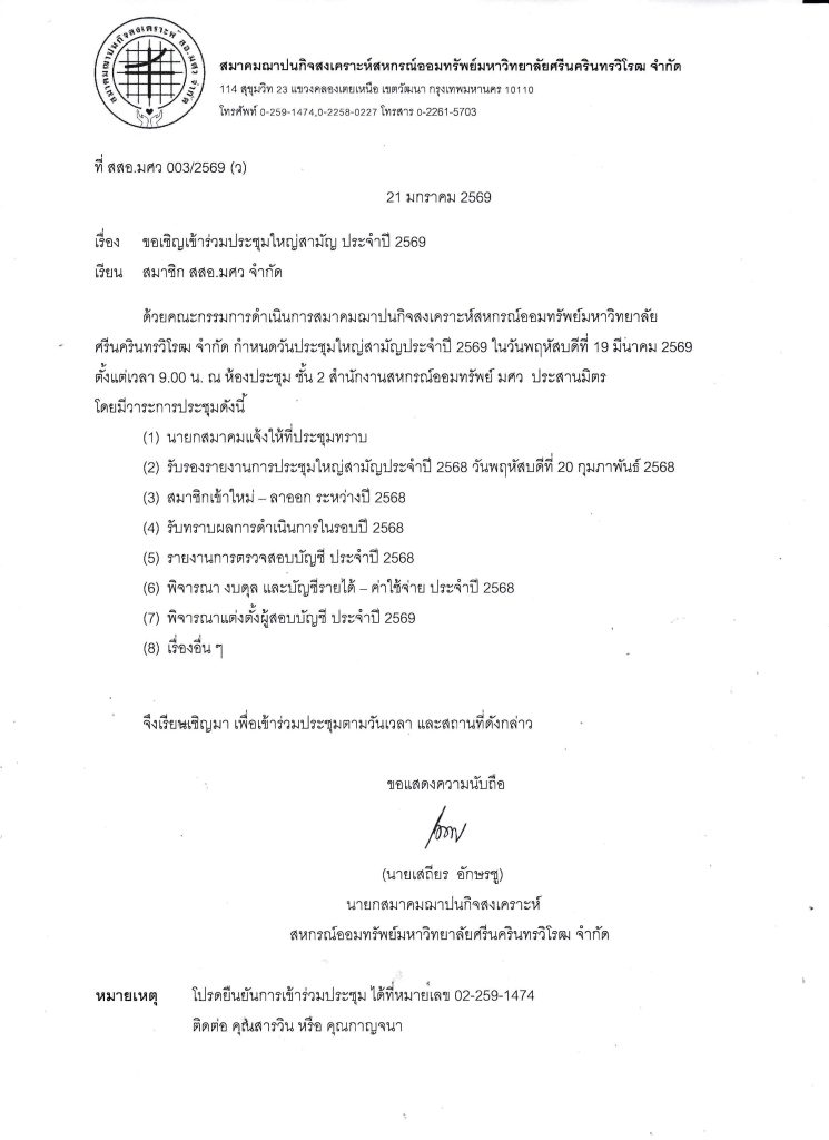 02/03/2026 By Poonmee Jitjaithiang ประกาศ สสอ.มศว ขอเชิญสมาชิกเข้าร่วมประชุมใหญ่สามัญประจำปี 2569 Share: Share List